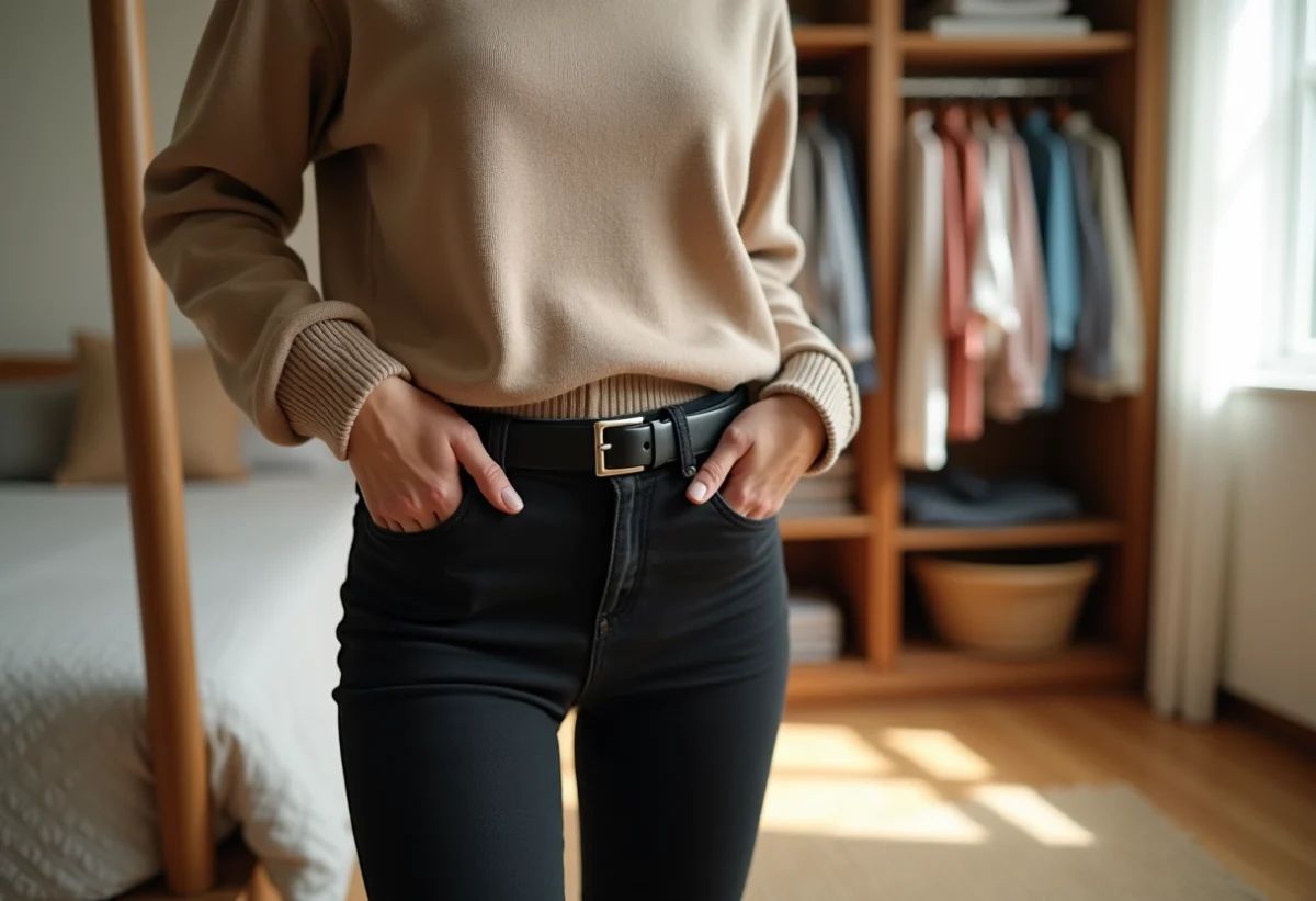 L’harmonie entre ceinture, accessoires et chaussures relève de la maîtrise. Avec un jean noir, la palette se resserre : place à la cohérence, à l’équilibre. La ceinture noire en cuir s’accorde naturellement à des chaussures noires, mais les nuances camel ou bordeaux introduisent une variation élégante, à condition de faire écho à d’autres détails du look.